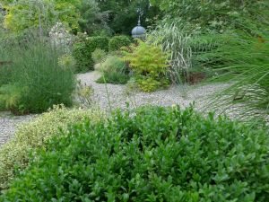 Verschlungene Wege führen durch den Garten von Pierette, Sitzmöbel romantisch, klassisch und modern laden immer wieder zum Betrachten und Verweilen ein. Ein kleiner Gemüsegarten mit Minihochbeeten bieten dennoch Vielfalt. Er wird überragt von einem Rundbogen zwischen diagonal liegenden Beeten auf dem ein Kürbis sich in die Höhe gewunden hat. Hohe Bäume spenden an heißen Tagen Schatten, doch die Rosen bekommen genügend Sonne um sich zu prachtvoll zu entfalten. Im Schuppen genießen wir dann in der Gruppe je nach Witterung mit warmen oder kühlen Getränken das Überraschungsbrot - lassen Sie sich überraschen!